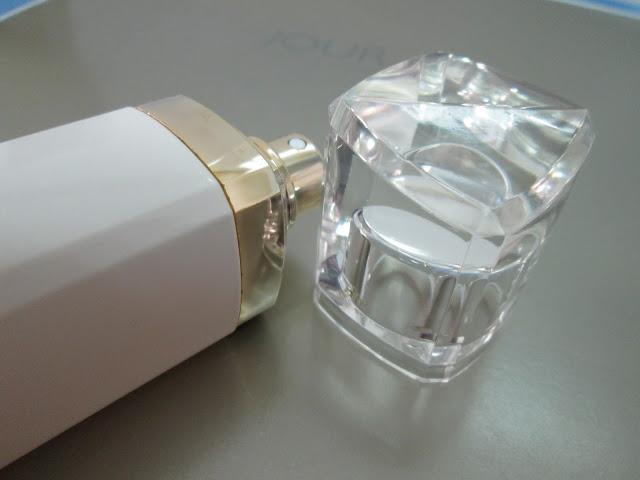El envase, como podéis ver en la foto, es sencillo, fino, pero a la vez elegante y sofisticado. Es totalmente blanco, que tiene una banda dorada, pero lo que le caracteriza es su tapón de cristal que refleja la luz, ya que parece un diamante.