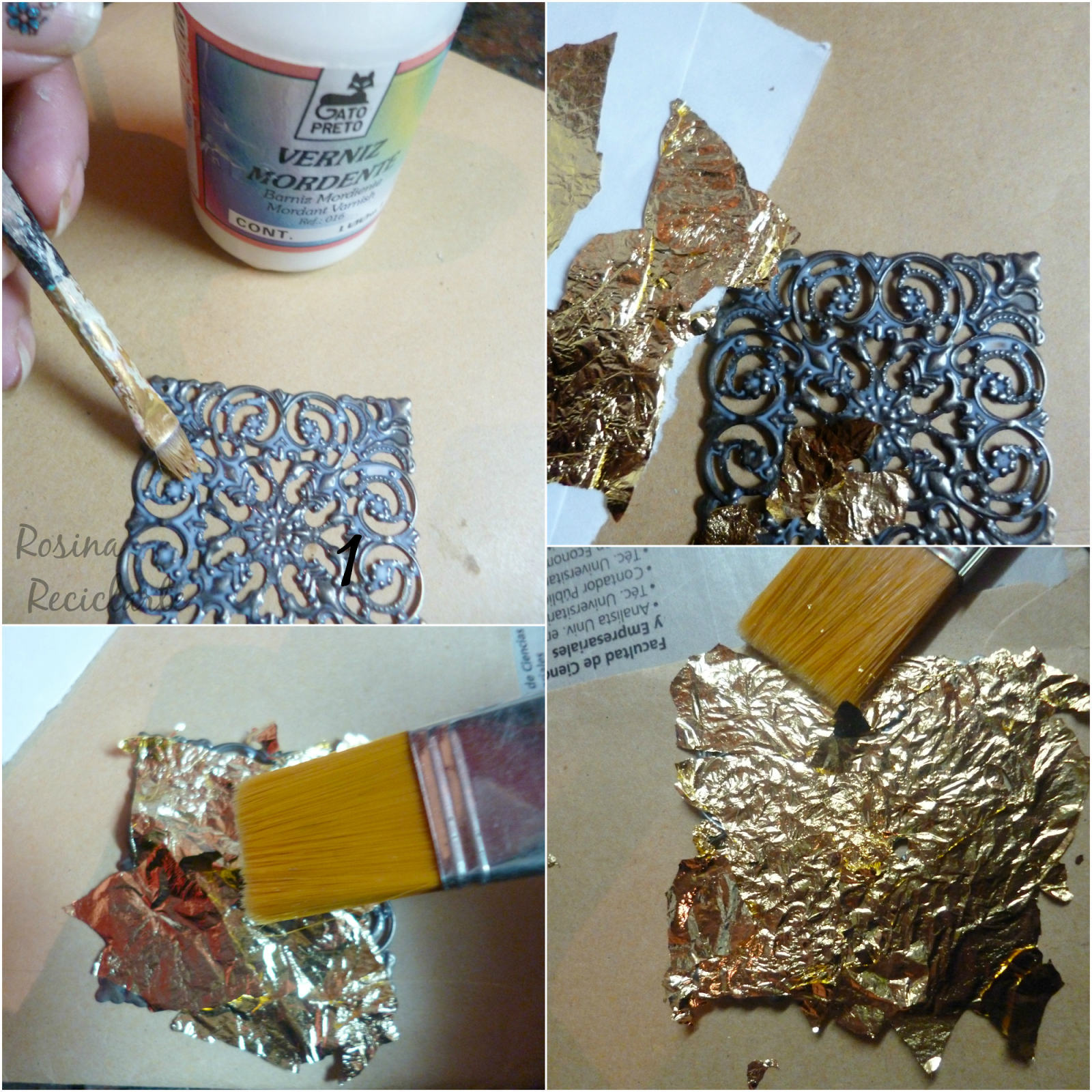 3-Apoyar las hojas de oro sobre la pieza y suavizar con pincel.
