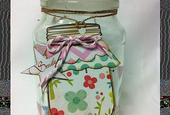 El segundo bote, también lleva banderines hechos con washi tape,pero solo en una fila, y le hemos puesto un detalle en la parte de abajo, con una blonda pequeña, washi tape y cuerda.