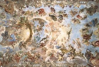 Bóveda del antiguo Salón de Embajadores del palacio del Buen Retiro, realizado junto al antiguo Cuarto Real de San Jerónimo y mandado levantar por orden del Conde Duque, como residencia real, lugar de esparcimiento y de recepción pública y oficial de los monarcas. Dentro de este conjunto, en la parte oriental, se levantó un pequeño edificio, encargado después de la inauguración del Palacio del Buen Retiro (1632) a Alonso Carbonel, aunque el remate final de las obras parece que se realizó en 1692 (Palomino). Los restos que actualmente se conservan corresponden al Casón del Buen Retiro, donde se ubica la Biblioteca del Museo Nacional del Prado. Su primitiva estructura ha sido sucesivamente alterada, de modo que solamente se ha respetado del primitivo edificio el techo pintado por Luca Giordano si bien restaurado en varias ocasiones y transformadas o perdidas algunas de sus partes. La decoración de la bóveda representa la apoteosis de la monarquía española. Giordanodesarrolla una compleja iconografía repleta de símbolos, personajes históricos, mitológicos o alegóricos, todos ellos relacionados con la monarquía hispánica, que mostraba así su antigüedad, potencia militar y preeminencia entre las casas reales europeas. En el testero oriental se sitúa la escena más celebrada y que da nombre al conjunto: la entrega del vellocino al duque de Borgoña, Felipe el Bueno, de manos de Hércules, remontándose así al origen mítico de la Orden del Toisón de Oro tradicionalmente asociada a los monarcas españoles. Con ello Giordano se permitió la licencia de sustituir al adúltero Jasón por Hércules. Detrás aparece la proa del Argos, la nave que permitió a los argonautas, con Jasóna la cabeza, conquistar el mítico vellocino de oro, premio con el que esperaba recuperar su reino. Detrás, el mar, representado por Neptuno, Anfitrite y unas ninfas. En los extremos de la bóveda aparecen otros asuntos protagonizados por Hércules: a la izquierda, la Gigantomaquia y, a la derecha, su lucha con Anteo. La reiterada presencia de Hércules lo convierte en el indiscutible protagonista de la decoración, sin duda por su carácter virtuoso, que vence allí donde el resto habían fracasado, aspectos ambos que justifican su tradicional vinculación con la Monarquía española. El grupo de Hércules entregando a Felipe el Bueno el vellocino para que lo coloque en el collar de la orden se completa en su parte superior con el elegantísimo escudo de los territorios sometidos a la Casa de Austria: los reinos de Castilla y León, Aragón, Sicilia y Granada y, más abajo, Austria, Borgoña (antigua y moderna), Brabante, Flandes y Tirol. Todos ellos cobijados por la corona real, que acoge al sol en su interior. A ambos lados aparecen ninfas portando la diadema -signo de la Realeza- y el olivo -la Paz-. Continúa la bóveda celeste, en la que aparecen claramente las constelaciones de Géminis, Argos, Tauro, Leo, Draco, etc. A continuación, Giordano dispuso el Parnaso con los dioses del Olimpo presididos por Júpiter, sobre el que vuela el águila con la que habitualmente se asocia. En el extremo opuesto de la bóveda situó la representación alegórica de España a través de una figura femenina que porta en su mano derecha los cuatro cetros de sus reinos, sobre la que Giordano dispuso una serie de figuras que aluden a sus virtudes. A sus pies, a la derecha, pueblos de diverso origen y religión que se someten mansamente a la autoridad. La herejía -dragón-, el Furor Bélico, el Poder Temporal -león con cetro-, así como los reinos sometidos -armiños y coronas- y las riquezas ganadas en las campañas militares -monedas, joyas y objetos de oro y plata-, completan el significado del conjunto. A la derecha de España se encuentra un niño que despliega una cartela en la que puede leerse OMNIBUS UNUS, sentencia latina que puede traducirse como Uno para todos. En las esquinas de la bóveda aparecen las Cuatro Edades de la Humanidad: la Edad de Oro, la Edad de Plata, la Edad de Bronce y la Edad de Hierro, en cuya representación Giordano siguió muy de cerca el relato de las Metamorfosis de Ovidio y las imágenes creadas por Cesare Ripa (1560-1645) en su Iconología. La primera de ellas, junto a la Gigantomaquia, corresponde al periodo ideal de la humanidad, sin guerras ni enfermedades, en una permanente primavera que producía trigo sin necesidad de sembrarlo. La figura principal del grupo encarna a la propia Edad de Oro, mujer cubierta con un manto dorado y cobijada por una encina, el árbol de Júpiter, que vuelve su rostro hacia el escudo de la Monarquía española. A la izquierda se sitúa Céfiro, el viento del este, suave y benéfico, que precede a un cortejo de figuras que refuerzan su significado: un amorcillo con un molinete, un águila y una mujer que coloca unas alas a un segundo niño. Sobre ellos aparece Flora portando un cuerno que contiene los frutos de este benéfico periodo, precediendo a otras ninfas con espigas y frutos. La Edad de Plata está presentada por otra matrona con un manto de ese color, que porta en sus manos espigas y un arado, puesto que los frutos ya no brotan espontáneamente. A la derecha, las cuatro estaciones señalan la llegada de un clima menos benigno y, sobre ellas, el Tiempo, -una de las figuras más castigadas del conjunto-, que rige el ciclo de las estaciones. Junto a los pueblos sometidos por España aparece la Edad de Bronce, de índole más violenta y más proclive al uso de las salvajes armas, pero sin llegar a la depravación. Fiel a la propuesta de Ripa, nos muestra a una mujer cubierta con un manto color malaquita, yelmo con fauces de león y una lanza en las manos. A la derecha, Giordano representó un grupo de muy difícil identificación presidido por la imponente Minerva, una de las figuras más soberbias de todo el conjunto, que aparece en la bóveda por segunda vez, después de su decisivo combate contra los gigantes. Representa esta d