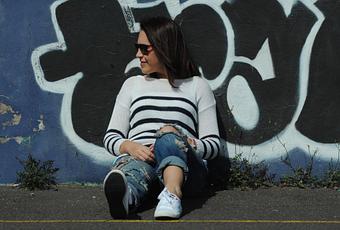 Para un día largo de tiendas, uno de esos días que estaba con las chicas buscando los regalitos para Nuri, necesitaba un look ultra cómodo, siempre intentando no perder el estilo. Creo que este look tiene mucho rollo por la mezcla de prendas sport, el jersey de punto y por la combinación de colores. Los pantalones boyfriend rotos en azul combinado con las rayas, creo que conjuntan a la perfección con las deportivas.