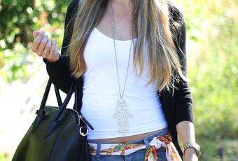Boyfriend jeans: Romwe (here) / Scarf (as belt): Romwe (here) / Basic t-shirt: Primark / Cardigan: Blanco / Bag: Oasap (here) / Sunglasses: Ray-Ban / Shoes: Zara / Watch: Michael Kors / Necklace: local store