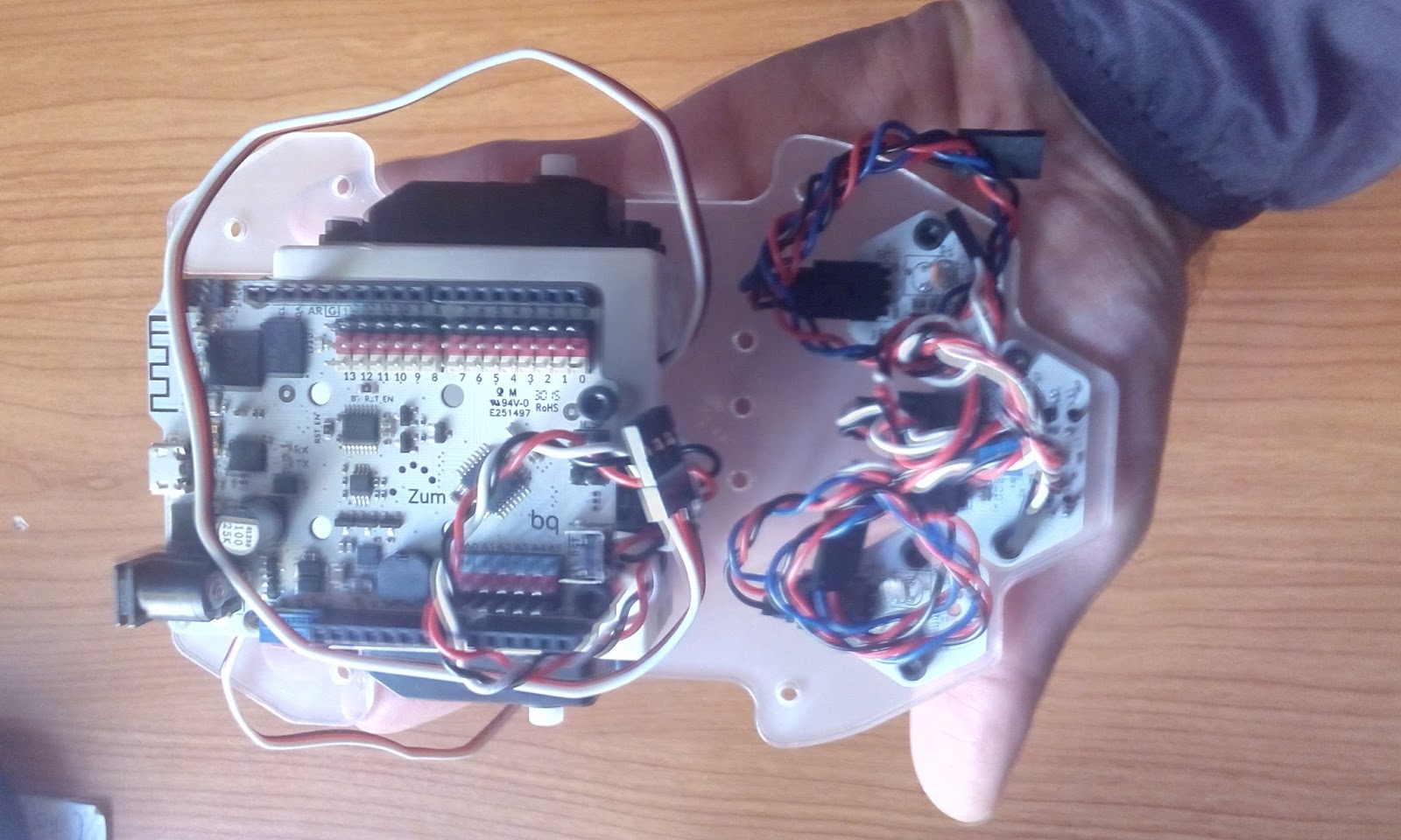 En la primera etapa de nuestro montaje, debemos anclar a la base de plástico nuestro microcontrolador. Cabe destacar que aunque bq proporciona su propio microcontrolador ICEZUM, en realidad este no es más que un Arduino modificado, el cual se le han añadido un par de pistas de Vcc y Gnd internas para poder tener de forma más accesible la conexión de servos y demás, pero podría aplicarse un Arduino para realizar la misma acción.