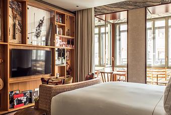 Brach Madrid no es un hotel cualquiera. Imagina entrar en un edificio de principios del siglo XX que respira historia (¡aquí vivió Victor Hugo de niño!) y descubrir un diseño que mezcla materiales cálidos, recuerdos de viajes y piezas únicas. Las 57 habitaciones, incluidas 4 suites, son una invitación a soñar: cabeceros de cuero, cerámicas artesanales, espejos imposibles y hasta pequeños guiños personales de Starck, como su amado caballito de mar.