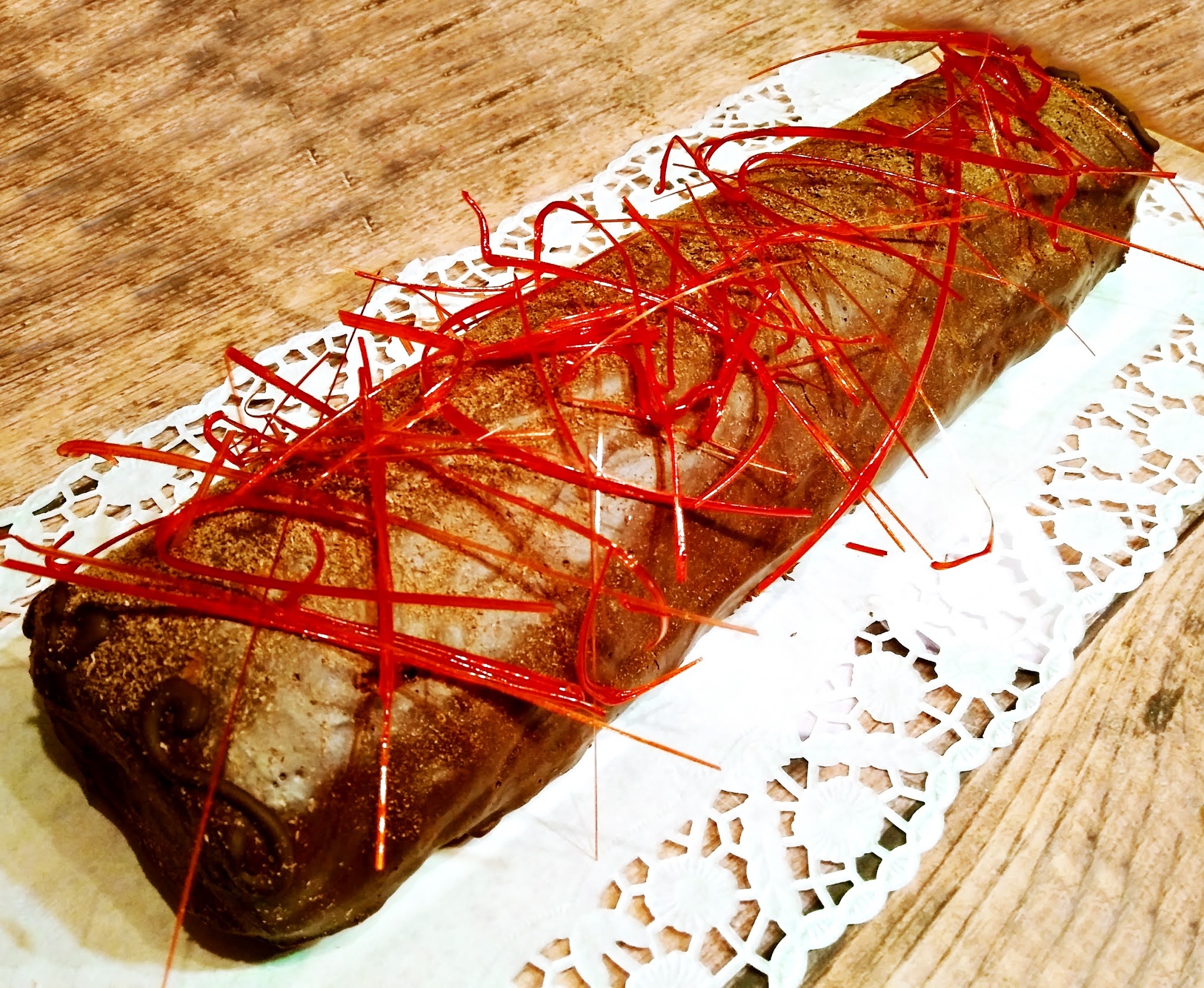 ➮Retira el bracito de la nevera y desenvuelve del film. Corta los extremos con un cuchillo para que quede más bonita la presentación.➮Coloca el bracito sobre una rejilla y debajo de esta pon una bandeja para poder recoger la crema de chocolate que vaya cayendo.➮Cubre el bracito con la cobertura de chocolate que deberá estar templada.