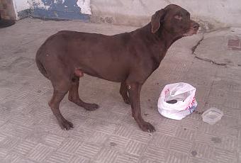 Este precioso braco dicen que lleva unos 6 meses abandonado. un hombre mayor le da de comer, pero en un mes se ha quedado famelico. Esta flojo y muy delgado, no ha querido beber agua con la calor, pero come todo lo que se le de.