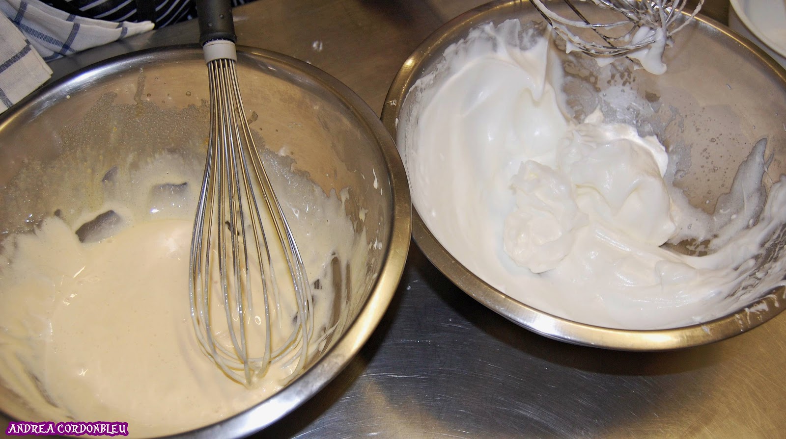 Para las planchas de bizcocho se montan por un lado las yemas con la mitad del azúcar (del color amarillo del principio, tienen que pasar a ponerse blancas) y por otro las claras con la otra mitad del azúcar.