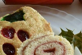 Ayudándonos de una brocha de cocina mojamos el bizcocho con el almíbar. Rellenamos con la mermelada extendiendo bien.Enrollamos el bizcocho formando un brazo de gitano, donde habremos recortado unos dibujos en la parte del último extremo que rellenaremos: las hojas con mermelada de kiwi con colorante verde y las bolitas con mermelada de fresa con colorante rojo. Tapamos con el mismo papel vegetal y llevamos a la nevera unas horas.Con una brocha pintamos por fuera con purpurina comestible.Cortamos y servimos.
