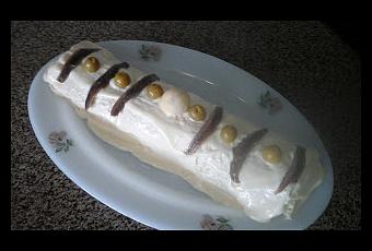 Lo sacamos le quitamos el papel y le untamos una capa generosa de mayonesa. Para decorar he utilizado la yema del huevo, la lata de anchoas y unas cuantas aceitunas, pero también podéis utilizar tomate, pimientos, pepinillos… Ahora ya sólo queda servir y comer.