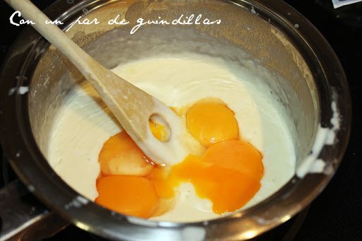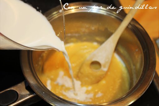 2.- Mientras, movemos con las varillas y vamos echando la leche poco a poco. Dejamos enfriar.