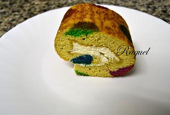 Yo empecé con uno de flores y me quedo muy bonito pero al enrollarlo se me rompió entonces hice otro pero este con dibujo mas sencillo con círculos de colores, porque tenia poco tiempo para prepararlo y la verdad que no quedo mal, aunque de aspecto, por lo demás estababuenísimo.Perdonarme pero olvide hacer las foto al brazo gitano de los lunares de colores con las prisas me olvide ainnss !! pero os pongo la foto del anterior que se me rompió para que os hagáis una idea de como se hace, le hice florecitas y quedo muy chulo lastima se me rompiera al enrollarlo.Animaros a prepararlo vosotros también y me contáis haber como os a quedado y si os ha gustado.Ingredientes:Para el bizcocho:4 huevos130 de azúcar170 harina2 cucharadas de levadurauna pizca de salColorantes (rojo,azul y verde)Para el almíbar de naranja100 ml. de Ron100 de AzúcarUn poco de aguaMermelada de naranjaPara el relleno:Nata montadaAzúcarPreparación:Batimos los huevos con el azúcar hasta que doble el volumen añadimos la pizca de sal y tamizamos la harina y la levadura, lo mezclamos todo bien y reservamos.Ponemos el horno a 180 grados.Depende de los colores a utilizar pondremos un poco de masa con los colorantes que queramos, yo puse estos.
