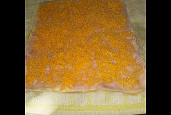 Cogemos la bandeja del horno y la cubrimos con papel de horno y engrasamos bien de mantequilla, ponemos toda la mezcla en la bandeja y queda un grosor de 2 centímetros más o menos, metemos en el horno aproximadamente de 8 a 9 minutos, Una vez echo lo pincháis por si necesita más cocción, lo sacamos de la bandeja con cuidado y lo pasamos a un paño húmedo y esperamos a que temple. Una vez que este frío untamos un poquito de mantequilla toda la superficie del brazo, para que salga más esponjoso, le vamos añadiendo lonchas de jamón de york hasta cubrir y por encima le ponemos el huevo hilado y con el mismo paño vamos enrollando,con cuidado del que el paño no quede pillado en el centro del brazo, conforme enrollamos, vamos sacando el paño,se deja enrollado con el paño y metemos en el frigorífico al menos una hora o dos, pasada esas horas lo pasamos a una bandeja y se sirve en rodajas de dos centímetros.