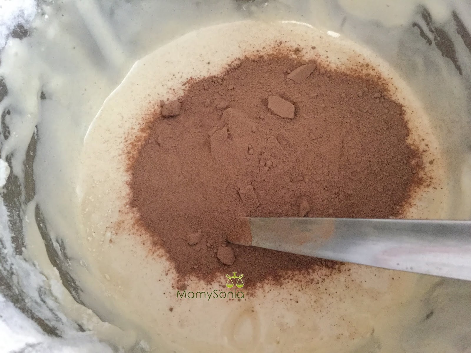 Añadimos la vainilla y harina tamizada, 10 Seg, Vel.2. Quitamos la mariposa y sacamos dos cucharadas de masa y reservamos en una manga pastelera, seguidamente incorporamos el cacao en polvo y terminamos de envolver con cuidado para no quitar el aire que metimos a los huevos.