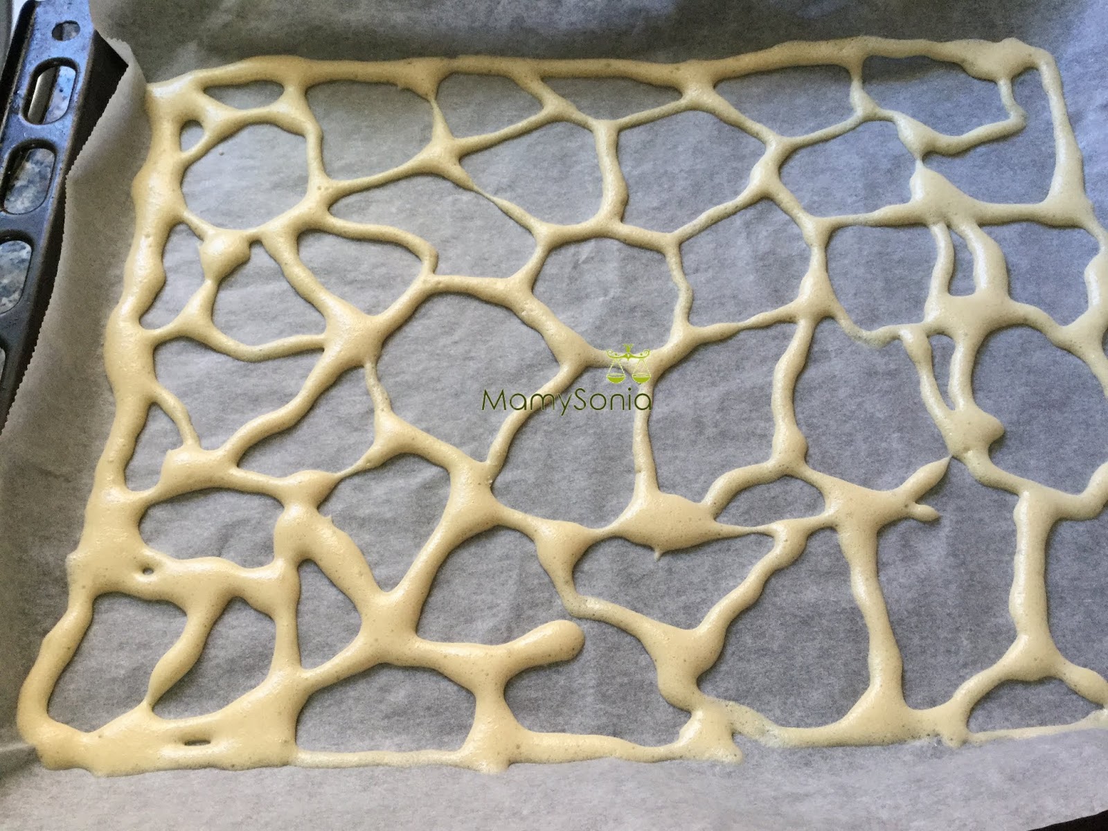 Ponemos papel de horno encima de la plantilla y pasamos la masa reservada a una manga pastelera con una boquilla con un agujero pequeñito, si no tenemos boquilla le haremos un pequeño agujero a la manga y nos valdrá igualmente. Solo tenemos que ir cubriendo las rayitas de las separaciones de las manchas.