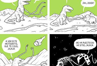 Autor de los álbumes "Campamento Turbulento", "Tramperos Especistas" y del recopilatorio de sus trabajos para El Jueves "Abierto en Canal" (todos editados por Fandogamia), el santanderino Alvaro Terán publica periódicamente tiras de humor gráfico cargadas de ironía bajo el nombre de "Le puede pasar a usted". En algunas ocasiones, los dinosaurios han sido protagonistas de sus viñetas como este tiranosaurio de brazos largos que se viene arriba y acaba escaldado.
