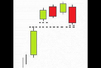 - El segundo día es una vela verde con un cuerpo real pequeño que abre un gap al alza sobre la vela del primer día. El tercer y el cuarto día se van formando otras dos velas verdes y rojas con cuerpo reales pequeños que continúan en la dirección del segundo candlestick formando cierres de máximos consecutivos.