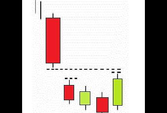 - El segundo día es una vela roja con un cuerpo real pequeño que abre con gap bajo la vela del primer día. El tercer y cuarto día se van formando otras dos velas verdes y rojas con cuerpo reales pequeños que continúan en la dirección del segundo candlestick formando cierres de mínimos consecutivos.