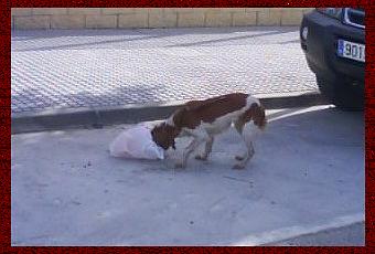 En la puerta de mi trabajo ha aparecido este perrito, no se si abandonado o perdido, porque tiene un collar de cuero y otro antipulgas, pero esta muy delgadito el pobre, yo le llevo un poco de pienso, pero no se acerca, supongo que come cuando nos vamos, está muy sucio pero tiene carita de bueno, animalito, creo que le habran pegado...Es de tamaño mediano, canela y blanco. Esta en Jerez