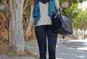 Bueno chicas, vamos a lo que nos interesa. Hoy os quería enseñar este bonito pañuelo de Briannefaye, me encanta la mezcla de color azul con verde ¿qué os parece?. Lo he combinado con mi jersey de Zara del año pasado (me chifla!) y jeans azules con estampado étnico (muy discretos ¿verdad?).