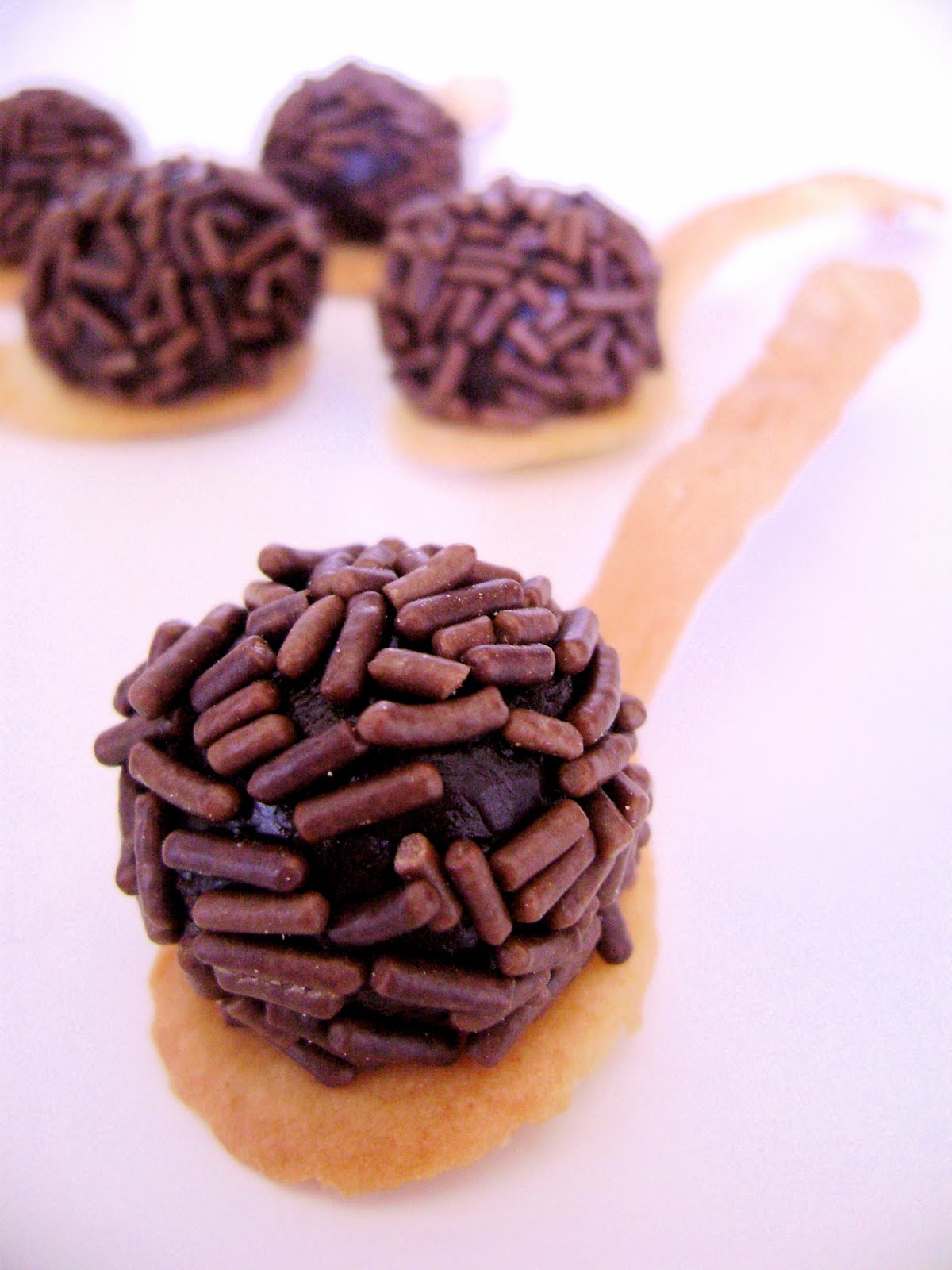 6. Hacer bolitas pequeñas con el brigadeiro y rodar en los fideos de chocolate, dejando una parte sin fideos para que pegue en la cucharadita de galleta.