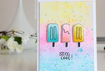 He usado el set de sellos "So Cool " de Simon Says Stamp y he empezado el fondo en blanco con unos cuantos helados. Después he coloreado el panel con tintas Distress (Squeezed Lemonade, Picked Raspberry y Peacock Feathers) y lo he dejado secar al aire.