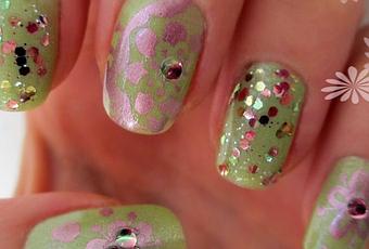 Como base usé un esmalte que me gusta mucho tanto por su color como por su olor. Es un perfumado a manzana de H&M y huele que es una delicia hasta tiempo después de haber hecho la manicura. Estampé en rosa trozos de flores de un platito de la última colección de Pueen que es de mis preferidos; en la foto de los materiales podéis ver lo mono que es. En el centro de las flores coloqué estos preciosos brillantitos. Las uñas del índice y anular las decoré con un glitter de Claire´s que me vino para esta manicura que ni pintado porque tiene exáctamente los mismos tonos de la manicura.