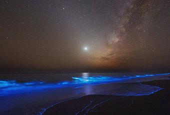 En estos brillos nocturnos, lo primero que notamos en el primer plano, es una luz azul eléctrico producido por el plancton bioluminiscente. El plancton no brilla por si solo. Muchas veces usan chorros de productos químicos que arrojan al agua como defensa contra los depredadores. Algunos también usan su bioluminiscencia para atraer pareja.