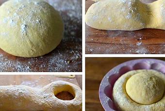 En este punto vamos ha darle forma, para ello no hay nada mejor que una buena imagen para explicar gráficamente el como hacerlo. Para ello tendremos que estrangular ligeramente una porción de la masa, con esto conseguiremos una especie de bola mas pequeña unida a una porción alargada y en la bola haremos la forma de una rosquilla, para finalizar tan solo tendremos que introducir la sección alargada por el aro de la parte de rosquilla. Colocaremos en nuestro molde con forma acanalada, tapamos con un paño húmedo y dejamos reposar de 20-30 minutos. Transcurrido este tiempo tendremos el horno precalentado a 200ºC, con la ayuda de un pincel pintamos con huevo la parte superior de nuestro brioche, justo antes de introducirlo en el horno, con la ayuda de un pulverizador, pulverizamos con agua fría el horno e introducimos en el horno. Horneamos durante 30-35 minutos, tras 20 minutos si vemos que se esta dorando demasiado rápido, podemos cubrir la parte de arriba con papel de aluminio, retiramos del horno y dejamos enfriar.
