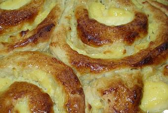 Pasado el tiempo de levado amasamos de nuevo y con un rodillo aplastamos hasta formar un rectángulo. Extendemos la crema pastelera (en este enlace podéis consultar la receta de crema pastelera rápida en micrrondas) por toda la superficie de la masa. Enrollamos la masa sin presionar y cortamos el rollo en porciones de unos cuatro centímetros de ancho. Colocamos las porciones en un molde de horno cubierto con papel de hornear. Tapamos de nuevo y dejamos que dupliquen el tamaño de nuevo. Este segundo levado es más corto, aproximadamente de una hora.Tras el segundo levado las porciones se juntarán cubriendo el molde, en ese momento pincelamos con un huevo batido e introducimos en el horno precalentado a 180 grados durante 25 minutos aproximadamente.