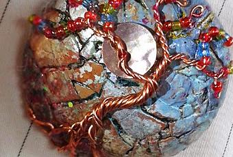 Este broche está realizado sobre la parte trasera de una lata de refresco cubierto con cáscara de huevo pintada, el alambre es de un ordenador, está adornado con rocalla de otros collares y una pieza de nácar de un pendiente desparejado, un poco de imaginación + un poco de habilidad = muchas opciones