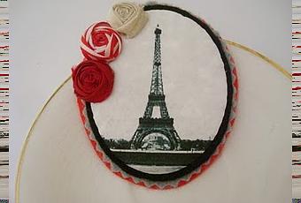 Broche realizado con serígrafía de aire antiguo de la Torre Eiffel sobre fieltros en negro, gris y rojo. Lleva aplicaciones de rosetas realizadas en seda india.