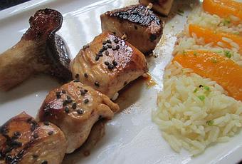Sirve enseguida las brochetas con su guarnición de setas y arroz (pon ralladura de lima sobre el arroz).
