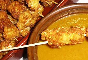 7. Insertar en los palos el pollo ya frito y ponerlos en la fuente de presentación.
