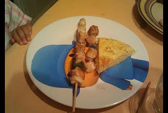 Brocheta de pollo y tortilla de patata