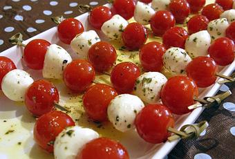 RECETAIngredientes:- Mozzarella en bolitas- Tomates cherry- Sal- Pimienta negra- Orégano- Aceite de olivaElaboración:No tiene misterio. En un plato preparamos el aliño, aceite, sal, pimienta y orégano al gusto. Introduciendo en él las bolitas de mozzarella y los tomates cherry, impregnándolos bien por todos los lados.Vamos insertando tomate, mozzarella y tomate en las brochetas y colocamos en una fuente.Aliñamos por encima con el sobrante del plato y listo."CAPRICHO DE DIOSES... una hojita fresca de albahaca al final de la brocheta para darle el toque perfecto. Fácil, rápido y vistoso, y por supuesto rico, rico."