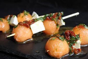 Brochetas de cataloupe y mozarella con vinagreta de albahaca y tomates secos