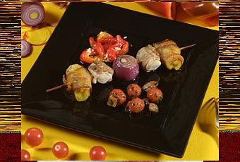 Sirve en una fuente las brochetas, riega con el jugo que han soltado, sirve al lado el salteado de tomates y acompaña con la ensalada de pimientos morrones.Fuente: hogarutil