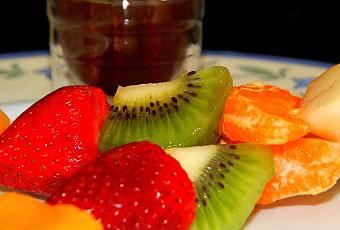 Lo primero es la fruta. Elegimos las frutas que más nos gusten o las que más a mano tengamos, las pelamos y las partimos en trozos. Es mejor evitar las frutas que se oxiden, sino darán un mal aspecto a la hora de servir. Pero si nos gustan mucho, o son las que tenemos, podemos echar un buen chorro de limón sobre ellas para retardar su oxidación. En mi caso, he tenido que hacer eso con la pera.