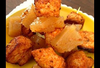 - Al día siguiente corto el membrillo en tacos iguales y voy friendo por los lados, con el mismo aceite del adobo el lomo. Es rápido.