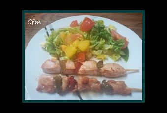 -Limpiamos la pechuga de pollo y retiramos cualquier resto de grasa o hueso-La cortamos en dados lo más parecidos de tamaño posible-Lavamos los pimientos y cortamos en trozos -Ensartamos los ingredientes en un palo de brocheta primero el pollo, un trozo de pimiento, y así sucesivamente-Sazonamos y echamos por encima el aliño-Encendemos la plancha, echamos unas gotas de aceite. -Tiene que estar a fuego bajo para que se vaya haciendo el pollo. -Vamos dándoles la vuelta -Cuando ya estén listas, subimos el fuego y doramos las brochetas-Montamos la ensalada, sazonamos y emplatamos junto a las brochetas