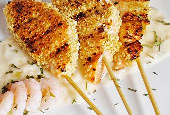 Quitar la piel y si tuviere alguna espina al salmón, cortar este a tiras de unos 2 cm. de ancho por unos 4-5 cm. de largo, introducir cada trozo en una brochea, pasar por huevo batido y rebozarlo con sésamo crudo. Asar en la plancha caliente hasta que el pescado esté cocido.