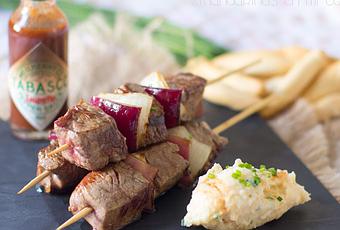 Cómo preparar brochetas de solomillo con tabasco chipotle con guarnición de cremoso de patatas y queso crema.