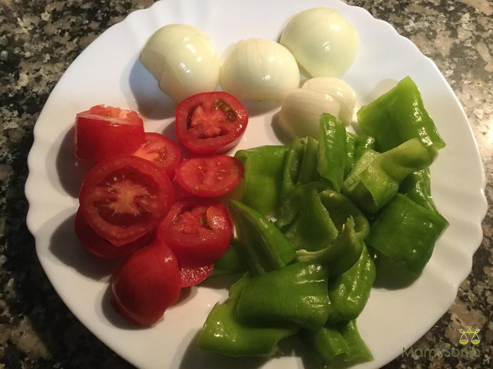 Mientras tanto partimos en trozos la cebolla , el pimiento y el tomate