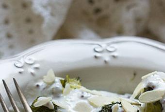 3. Servimos colocando los "arbolitos" de brócoli sobre un plato y regamos con unas cucharadas de la salsa de yogur. Echamos por encima unas almendras laminadas.