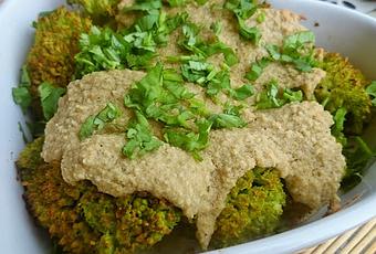 - Separamos el brócoli en ramilletes y los cocemos hasta que queden al dente. Colocamos el brócoli en una bandeja de horno y los cubrimos con la salsa de anacardos