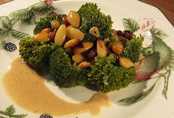 Elaboración Lavamos bien el brócoli y lo dividimos en ramilletes. Lo cocemos en abundante agua con sal durante unos 20/25 minutos aproximadamente. Una vez esté listo, escurrimos y reservamos. Preparamos entonces la salsa. Pelamos y laminamos los dientes de ajo. Los rehogamos en una sartén con aceite de oliva hasta que estén ligeramente dorados. Agregamos entonces las almendras, los piñones y las pasas y los rehogamos durante un par de minutos.