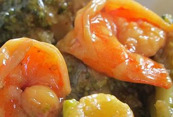 1 brócoli 300 gramos de langostinos o gambas crudas. 2 dientes de ajo 1 guindilla Pimienta ½ taza de café de salsa de soja ½ taza de café de aceite oliva virgen extra 1 cucharada de maicena 1 taza de café de agua. Un puñadito de sésamo (opcional)