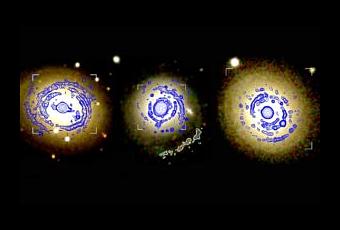 Composición de las tres galaxias elípticas estudiadas, con la estructura en forma de brazos espirales delineada en contornos. Crédito: SDSS y CALIFA.