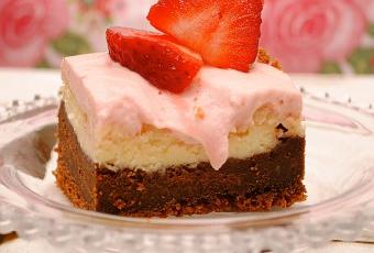 Esta tarta de queso lleva, además, una base de brownie de chocolate y una crema de fresas por encima (en realidad, en el libro lleva frambuesas pero yo tenía fresas en casa, así que las sustituí).