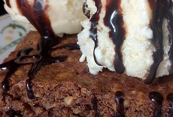 Cortar en porciones y servir aún caliente (si se ha enfriado aconsejo calentar en el microondas) y servir acompañándolo con helado (si se animan a hacer el helado casero, en ÉSTE ENLACE les dejo algunas recetas) y regar con chocolate derretido (lo pueden encontrar en cualquier supermercado)….